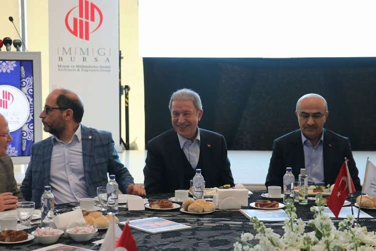 TBMM Milli Savunma Komisyonu Başkanı ve AK Parti Kayseri Milletvekili Hulusi Akar, Bursa Mimar ve Mühendisler Odası'nın düzenlediği çalışma toplantısına katıldı. Akar'a, Vali Mahmut Demirtaş, AK Parti Bursa İl Başkanı Davut Gürkan, Bursa Büyükşehir Belediye Başkanı Alinur Aktaş, AK Parti Bursa Milletvekilleri eşlik etti. Merinos Atatürk Kongre ve Kültür Merkezi Yıldırım Bayezid Salonu'nda düzenlenen çalışma toplantısına katılan Akar,"Türkiye'nin Güvenliği; Risk, Tehdit ve Tehlikeler" konulu bir sunum yaptı.