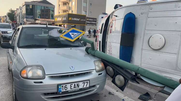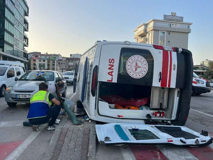Çarpışmanın şiddetiyle ambulans trafik ışıklarına ve levhaya çarptı. Levha da 16 EAN 77 plakalı başka bir otomobilin üzerine devrildi. Kazanın şiddetiyle ambulans yan yatarken, 1 sağlık personeli ve 2 vatandaş kazada yaralandı.