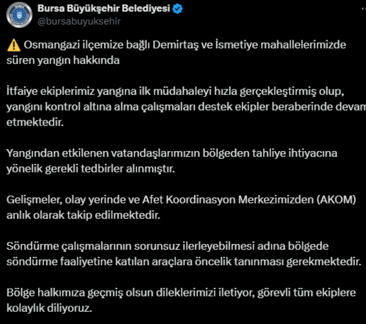 Belediyenin sosyal medya hesaplarından yapılan açıklamada, "Osmangazi ilçemize bağlı Demirtaş ve İsmetiye mahallelerimizde süren yangın hakkında İtfaiye ekiplerimiz yangına ilk müdahaleyi hızla gerçekleştirmiş olup, yangını kontrol altına alma çalışmaları destek ekipler beraberinde devam etmektedir. Yangından etkilenen vatandaşlarımızın bölgeden tahliye ihtiyacına yönelik gerekli tedbirler alınmıştır. Gelişmeler, olay yerinde ve Afet Koordinasyon Merkezimizden (AKOM) anlık olarak takip edilmektedir. Söndürme çalışmalarının sorunsuz ilerleyebilmesi adına bölgede söndürme faaliyetine katılan araçlara öncelik tanınması gerekmektedir. Bölge halkımıza geçmiş olsun dileklerimizi iletiyor, görevli tüm ekiplere kolaylık diliyoruz" ifadelerine yer verildi.