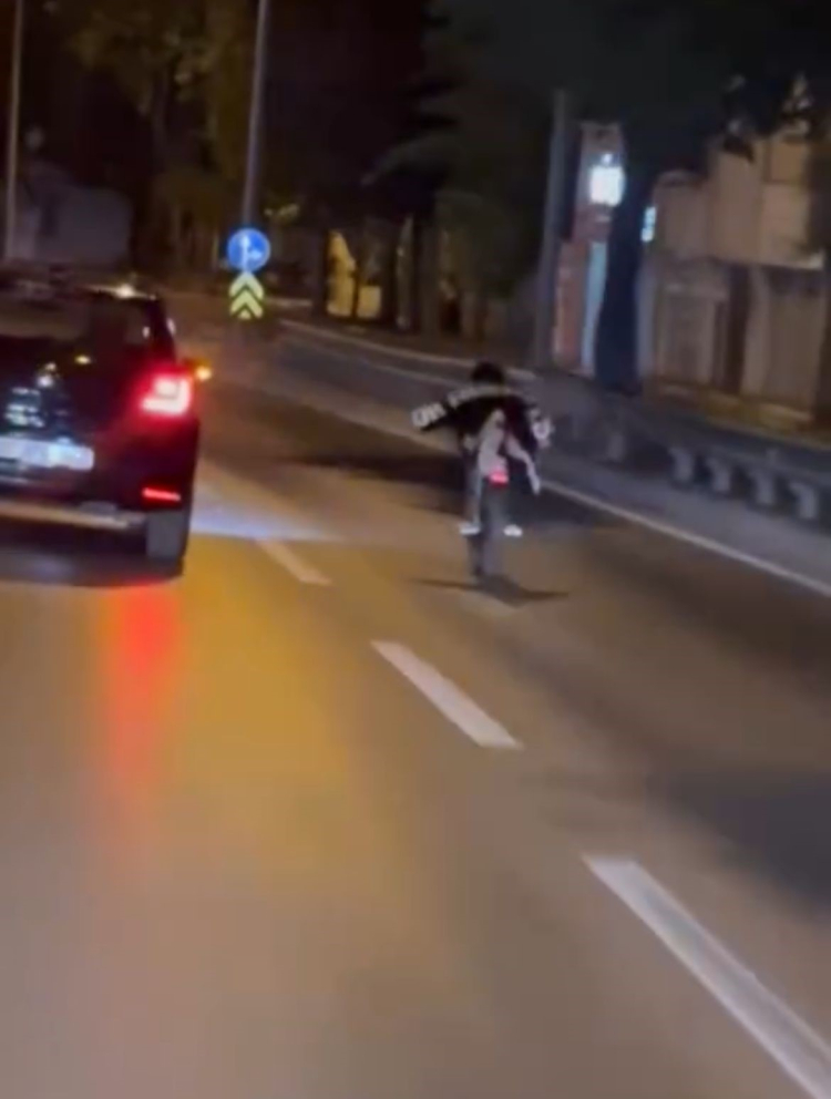 Bursa'nın Osmangazi ilçesinde motosikletli bir şahıs tek teker üzerinde uzun süre ilerleyerek trafikte adeta şov yaptı. Trafikte hızla manevra yapan sürücü, hem kural tanımadı hem de kazaya davetiye çıkardı. Bir başka görüntü ise merkez İzmir Yolu üzerinde kaydedildi.
