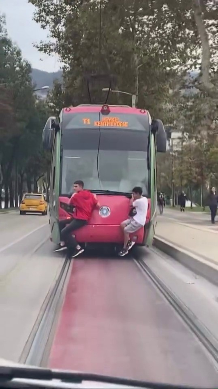 Bursa’nın Osmangazi ilçesinde yürekleri ağıza getiren anlar yaşandı. İki çocuk, seyir halindeki bir tramvayın arkasına tutunarak yolculuk yaptı. Dakikalarca trafikte ilerleyen çocukların tehlikeli yolculuğu, başka bir aracın kamerasına yansıdı.