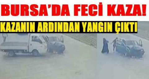 Kaza anı ve araçta yaşanan yangın ile yaralıların araçtan çıkarak kaçma anları bir iş yerinin güvenlik kameralarına saniye saniye yansıdı.