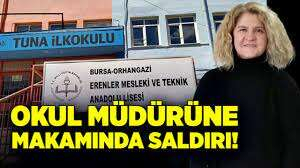 Bursa'nın Orhangazi ilçesinde Erenler Mesleki ve Teknik Anadolu Lisesi Müdürü Aysel Bağın, okulda 9.sınıfta eğitim gören bir öğrencinin ablası tarafından makamında saldırıya uğradı