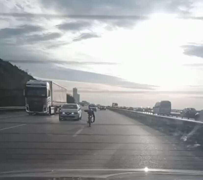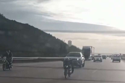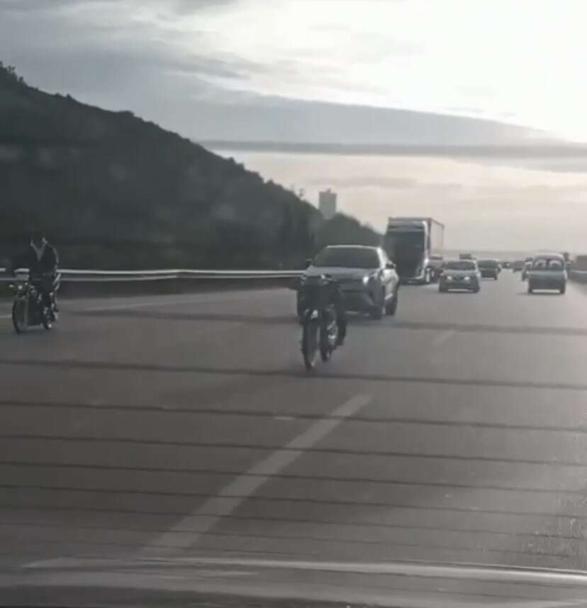 Diğer bir görüntü ise merkez Osmangazi ilçesi Gebze-Orhangazi-İzmir Otoyolu'nda meydana geldi. Edinilen bilgiye göre, seyir halinde olan motosikletin üzerine uzanan 2 kafadar genç yürekleri ağza getirdi. O anlar da cep telefonu kamerasına yansıdı.