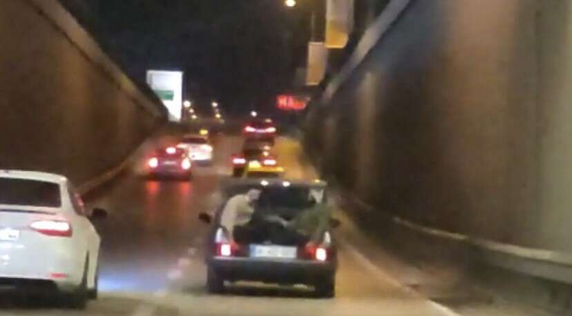 Olay, merkez Nilüfer ilçesi Beşevler Mahallesi İzmir Yolu Caddesi üzerinde meydana geldi. Edinilen bilgiye göre, arabada yer kalmayınca 2 genç çareyi bagaja oturmakta buldu. Trafikteki diğer sürücüler bagajda oturan gençleri görünce gözlerine inanamazken, o anlar cep telefon kamerasına yansıdı.