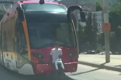 Bursa'da seyir halindeki tramvayın arkasında tutunarak seyahat eden gencin tehlikeli anları saniye saniye amatör kamera ile kaydedildi.