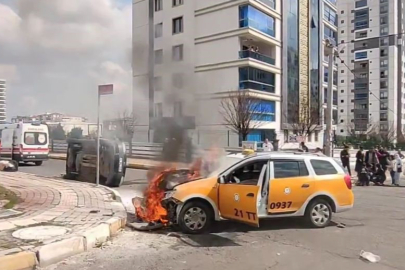 Diyarbakır’ın Kayapınar ilçesinde iki aracın çarpıştığı kazada ticari taksi alev aldı. O anlar güvenlik kamerasına yansıdı.