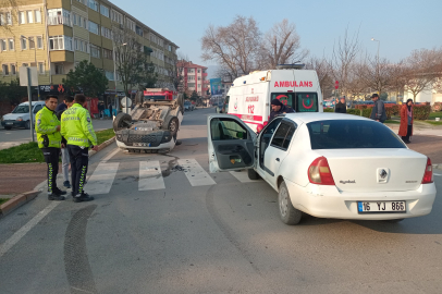 Döner kavşakta çarpışan 2 araçtan biri takla attı: 2 yaralı