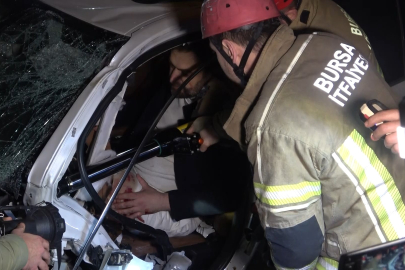 Bursa’da sürücüsünün kontrolünden çıkan otomobil, refüje çarparak durabildi. Kazada sürücü araç içerisinde sıkıştı.