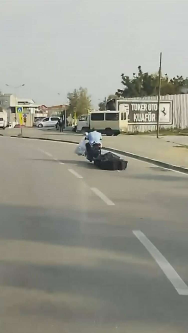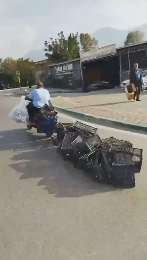 Bursa’da bir sürücü motosikletinin arkasına plastik kasalar bağlayıp yolculuk yaptı. O anlar cep telefonlarına yansıdı.