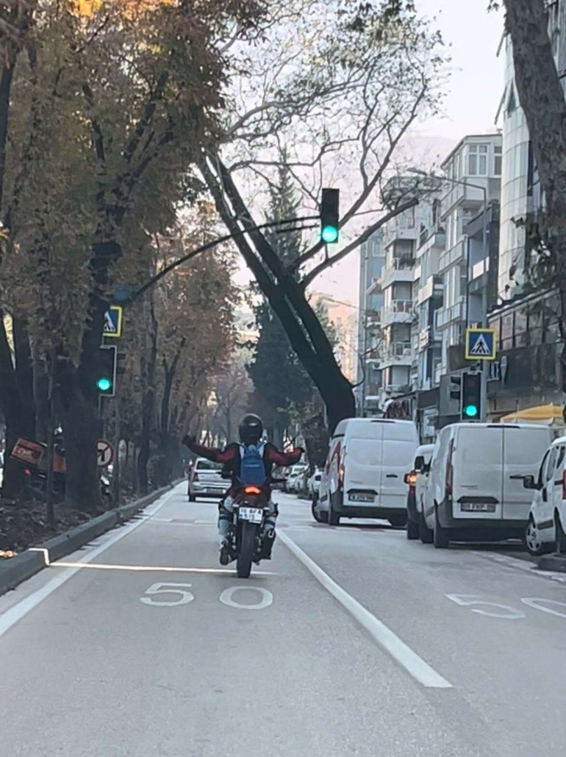 Bursa’da motosikletleriyle trafiğe çıkan arkadaşlar iki tekerlek üzerinde dans ettiler.