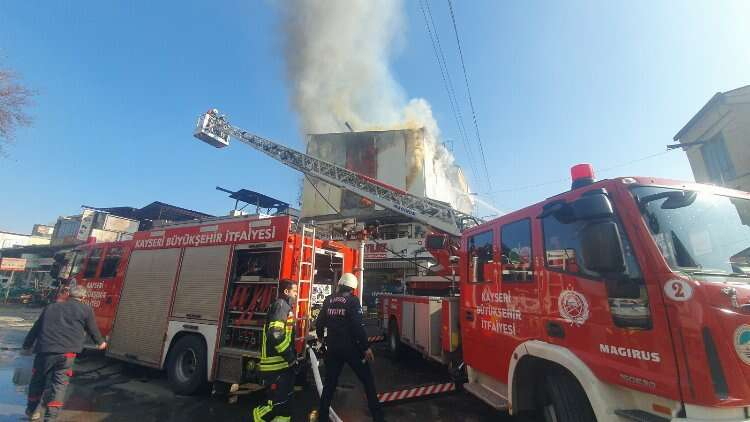 Kayseri’nin Kocasinan ilçesinde bir iş yerinin deposunda çıkan yangına ekiplerin müdahalesi devam ediyor.