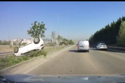 Bursa'nın Nilüfer ilçesinde kontrolden çıkan otomobil, bariyerleri aşarak ters yöne geçti. Takla atan araçta bulunan karı-koca kazayı yara almadan atlatırken, o anlar araç içi kamerasına yansıdı.