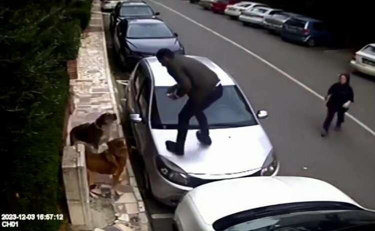 Köpeklerin saldırısından arabanın üstüne çıkarak kaçmaya çalışan vatandaşların o ilginç anları ise çevredeki güvenlik kamerası yansıdı.