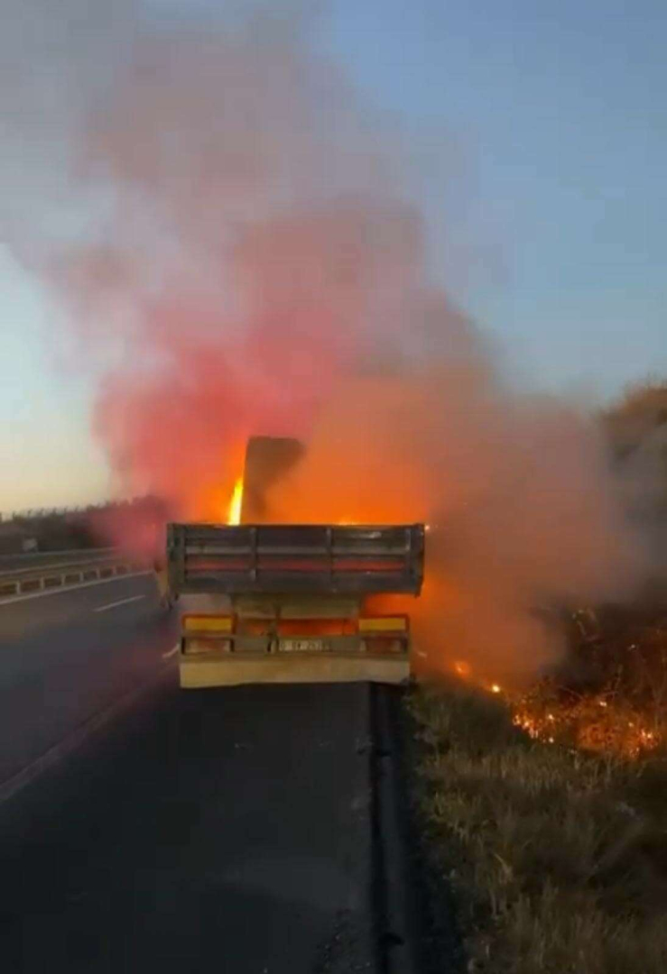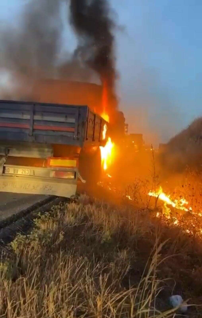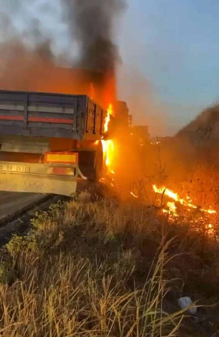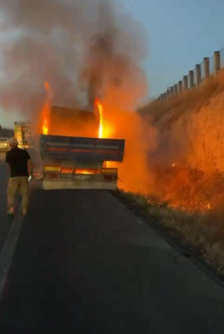 Hızla büyüyen alevler tırdan anayoldaki otluk alana sıçradı. Sürücünün ihbarı üzerine olay yerine itfaiye ekibi sevk edildi.