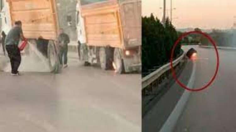 Anayolda ilerleyen bir kamyon sürücüsü, kamyonun tekerinin fırlamasıyla şoke oldu. Hemen aracı kenara çeken sürücü, eline aldığı suyla lastiklerin bulunduğu kısımda çıkan alevleri söndürmeye çalıştı.