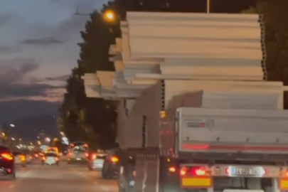 Bursa'da bir tır sürücüsü, açık dorsesine fazla yük alarak kilometrelerce ilerledi. Tehlikeli anlar saniye saniye amatör kameraya yansıdı.