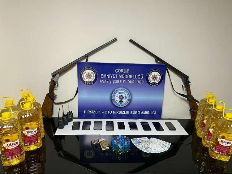 Şüphelilere ait evlerde yapılan aramada 2 kamu kurumunda meydana gelen hırsızlıkta çalınan ve soruşturmaya konu olan 9 adet 5 litre sıvı yağ, 7 bin TL nakit para ve 34 adet fişek, 3 Adet telsiz, kaçak alkol yapımında kullanılan çok sayıda materyale el konuldu.