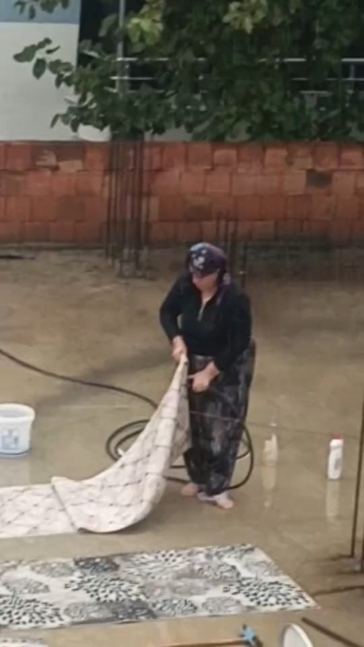 Bursa’da su kesintisi yapılırken, yağmur altında hortumla halı yıkayan bir kadın tepkiye sebep oldu. O anlar çevredekilerin cep telefonu kameralarına saniye saniye kaydedildi.