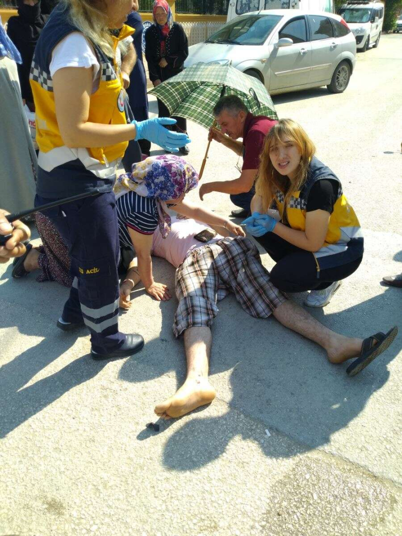 İnegöl'de, otomobille çarpışan motosikletin sürücüsü İlker Doğan ve kardeşi İlknur Doğan yaralandı. Vatandaşlar, yaralı kardeşleri sağlık ekibi gelene kadar şemsiyeyle güneşten korudu.
