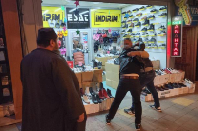 Arkadaşı ile caddede yürüdüğü sırada baba ve oğlunun saldırısı sonrası yüzü kanlar içinde kalan genç, ayakkabı dükkanına sığındı.