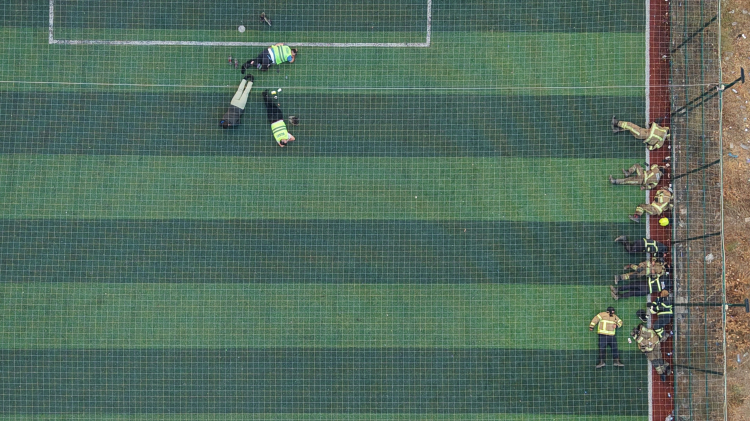 Bursa'da üç ilçeyi etkileyen ve 3 köyün boşaltılmasına sebep olan yangında 12 saat boyunca fedakarca çalışan ve ormanın derinliklerine girip alevleri bastıran itfaiye erleri bir halı sahada istirahate çekildi. Halı sahada zor şartlarda birkaç saatliğine dinlenip yeniden göreve gitmek için hazırlanan itfaiye erleri dikkat çeken görüntüler oluşturdu.