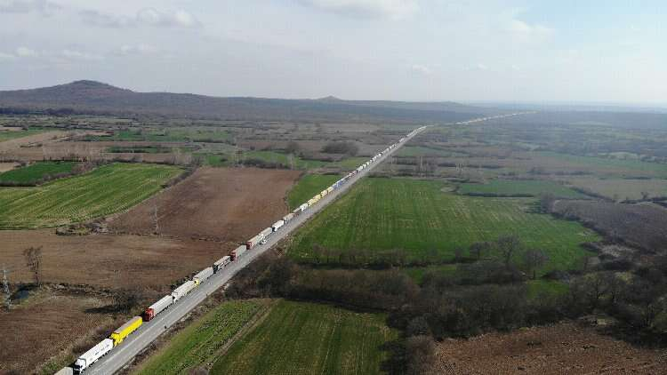 Edirne’de Hamzabeyli Sınır Kapısı'nda ihracat yüklerini götürmek için bekleyen tır sürücüleri kilometrelerce kuyruk oluşturdu.
