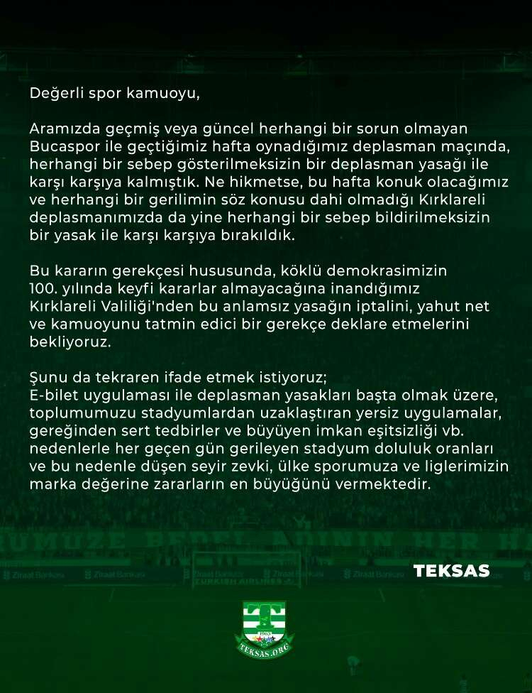 “Değerli spor kamuoyu, aramızda geçmiş veya güncel herhangi bir sorun olmayan Bucaspor ile geçtiğimiz hafta oynadığımız deplasman maçında, herhangi bir sebep gösterilmeksizin bir deplasman yasağı ile karşı karşıya kalmıştık. Ne hikmetse, bu hafta konuk olacağımız ve herhangi bir gerilimin söz konusu dahi olmadığı Kırklareli deplasmanımızda da yine herhangi bir sebep bildirilmeksizin bir yasak ile karşı karşıya bırakıldık.