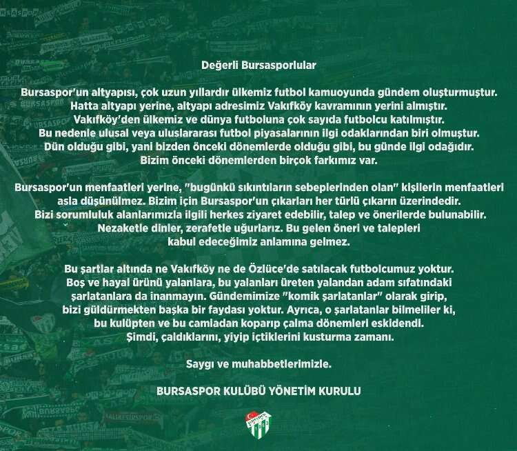 Bizim önceki dönemlerden birçok farkımız var. Değerli Bursasporlular, Bursaspor'un menfaatleri yerine, ‘bugünkü sıkıntıların sebeplerinden olan’ kişilerin menfaatleri asla düşünülmez. Bizim için Bursaspor'un çıkarları her türlü çıkarın üzerindedir. Bizi sorumluluk alanlarımızla ilgili herkes ziyaret edebilir, talep ve önerilerde bulunabilir. Nezaketle dinler, zarafetle uğurlarız. Bu gelen öneri ve talepleri kabul edeceğimiz anlamına gelmez. Bu şartlar altında ne Vakıfköy ne de Özlüce'de satılacak futbolcumuz yoktur. Boş ve hayal ürünü yalanlara, bu yalanları üreten yalandan adam sıfatındaki şarlatanlara da inanmayın. Gündemimize 'komik şarlatanlar’ olarak girip, bizi güldürmekten başka bir faydası yoktur. Ayrıca, o şarlatanlar bilmeliler ki, bu kulüpten ve bu camiadan koparıp çalma dönemleri eskidendi. Şimdi, çaldıklarını, yiyip içtiklerini kusturma zamanı. Saygı ve muhabbetlerimizle. Bursaspor Kulübü Yönetim Kurulu.”