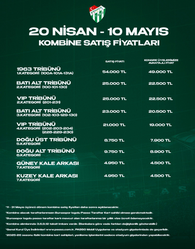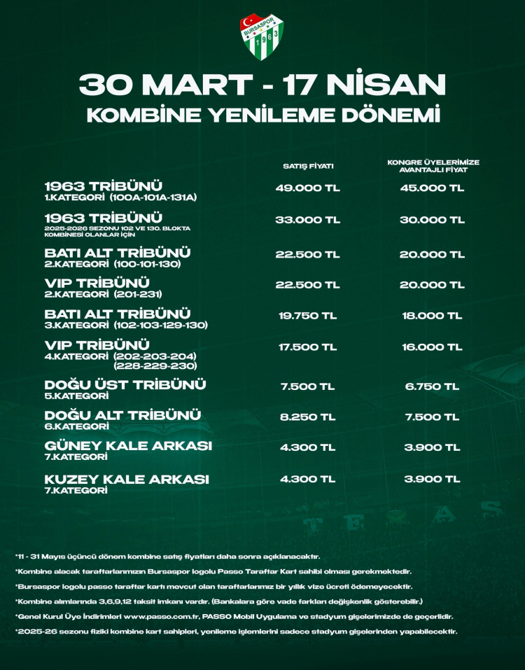 Yenileme döneminin ardından, boş kalan koltuklar için genel satış dönemi 20 Nisan tarihinde başlayacak. Yeni kombine almak isteyen tüm Bursaspor taraftarları, 10 Mayıs tarihine kadar bu dönemden yararlanabilecekler. Satışlar PASSO platformları ve stadyum gişelerinden devam edecek.