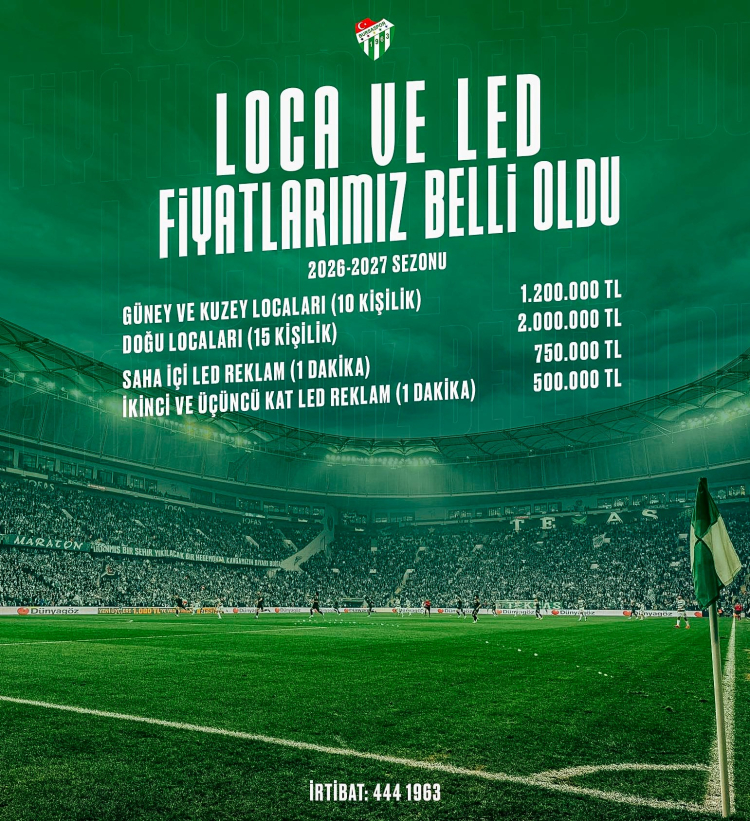 Bursaspor’un Yeni Sezon Loca ve LED Reklam Fiyatları Açıklandı