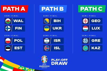 EURO 2024'te bulunacak son 3 takımın belirleneceği play-off etabının eşleşmeleri belirlendi. İsviçre'nin Nyon şehrindeki UEFA Genel Merkezi'nde yapılan kura çekiminde yarı final eşleşmeleri şu şekilde oluştu:
