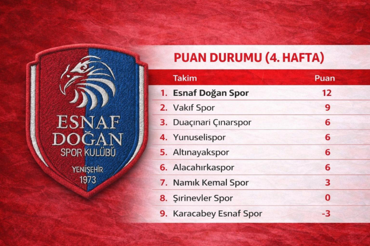 9 puanla ikinci sırada yer alan Vakıf Spor’un önünde liderliğini sürdüren Esnaf Doğan Spor, ortaya koyduğu istikrarlı grafikle şampiyonluk yolunda önemli bir avantaj yakaladı. Takımın saha içindeki uyumu ve mücadele gücü, sezonun geri kalanı için umut veriyor.