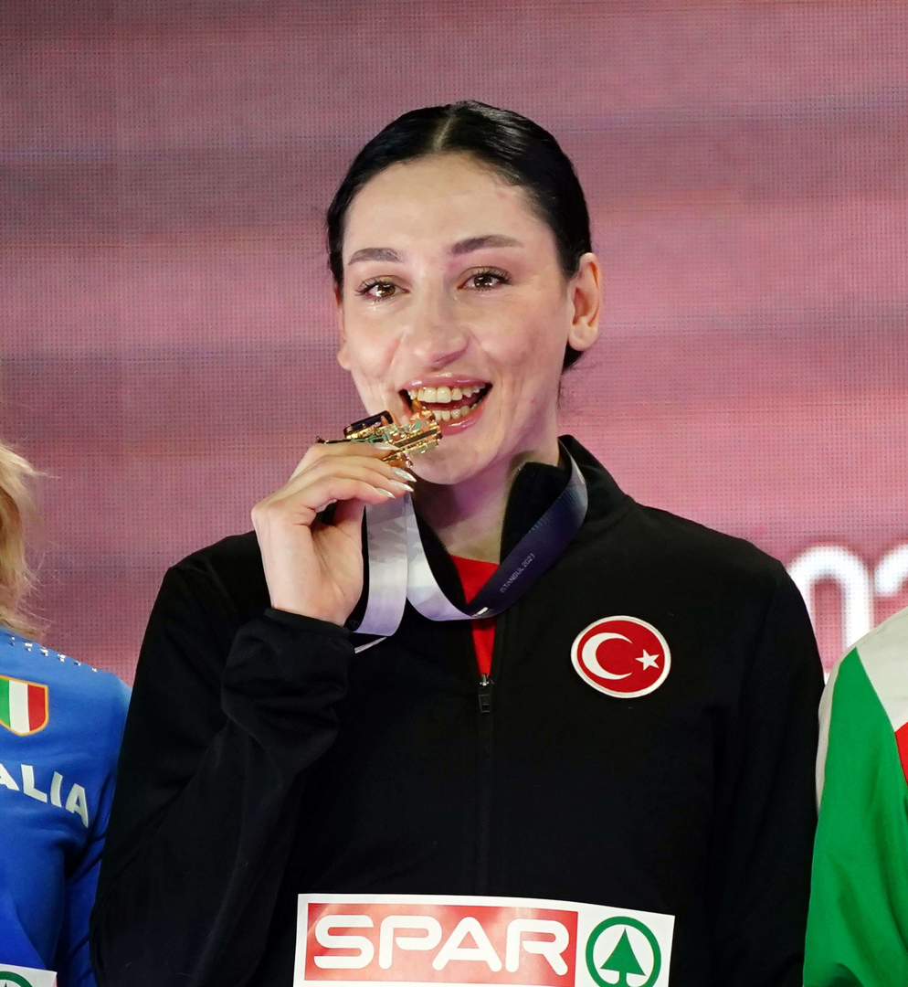 Avrupa Salon Atletizm Şampiyonası'nda kadınlar üç adım atlamada altın madalya kazanan milli sporcu Tuğba Danışmaz, yapılan törenle madalyasını aldı.