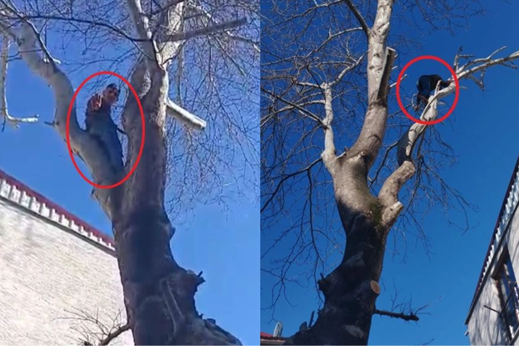 Şüphelilerden biri yakalanacağını anlayınca kedi gibi dümdüz ağaca tırmanıp polise el salladı
