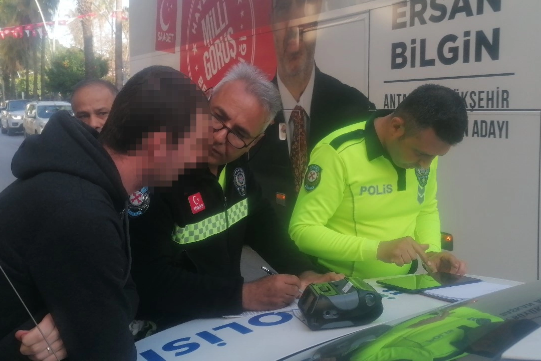 Antalya'nın Manavgat ilçesinde alkollü otomobil kullandığı tespit edilen sürücü, alkolmetreyi üflemek istemeyince ekiplere zor anlar yaşattı. Alkollü sürücü, "Alkolmetreyi eşim üflesin, arabayı ben değil eşim kullanıyordu. Niye bana üfletmeye çalışıyorsunuz?" tepkisini gösterirken, daha önce hakkında 2 kez alkollü araç kullanmaktan işlem yapıldığı belirlenen araç sürücüsüne alkolmetreyi üflememekten 18 bin 452 TL para cezası uygulandı ve ehliyetine 2 yıl süreyle el konuldu.