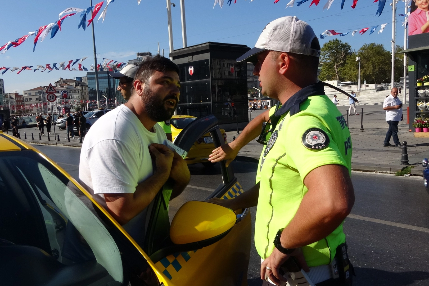 Taksiciye 4 bin 64 TL ceza yazılırken, aracı da trafikten men edildi. İstanbul Emniyet Müdürlüğü, Trafik Denetleme Şube Müdürlüğü ekiplerince, yolcu seçen ve kural ihlali yapan ticari taksilere yönelik denetim gerçekleştirildi. Taksim’de yapılan denetimde, trafik işaretlerine uymayan 3 sürücüye 436’şar TL, yolcu seçen ve yolculara fiyat veren 3 taksiciye ise 4 bin 64’er TL; toplamda 16 bin 265 TL ceza kesildi. Yolcu seçen ve yolculara fiyat veren taksicilerin araçları bağlanarak trafikten men edildi. Anahtarı polise vermek istemedi, gerginlik yaşandı Denetim sürerken, yolcu seçtiği için aracı bağlanacak olan bir taksici, polisle tartıştı. Taksisinin bağlanmasını istemeyen sürücü, oradan uzaklaşmak için aracına bindi ancak polis, aracın anahtarını alarak ona engel oldu. Taksici ise "Arabamı bağlatamam. Gözünü seveyim, ağabey. Arabamı neden bağlıyorsun?” diye tepki gösterdi. Taksicinin kullandığı araç çekiciyle kaldırılarak trafikten men edildi. İstanbul Emniyet Müdürlüğü Trafik Denetleme Şube Müdürlüğü ekiplerince, ticari taksilere yönelik gerçekleştirilen denetimlerin devam edeceği öğrenildi.
