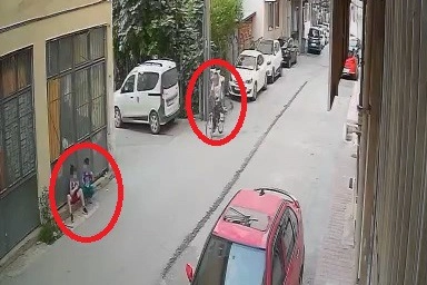 Güvenlik kamerasına yansıyan görüntülerde, arkadaşıyla oturan Trabzonspor formalı 9 yaşındaki bir çocuk, sokak arasında bisikletiyle ilerleyen bir kişinin önce hakaretlerine ardından biber gazlı saldırısına uğradı.