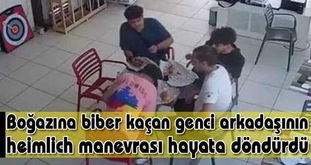 Bursa’da restoranda yemek yediği sırada nefes borusuna biber kaçan genci, arkadaşının heimlich manevrası hayata döndürdü.