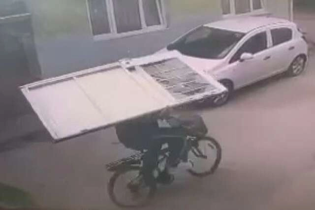 Kapıyı sırtlayarak bisiklete binen hırsız, bir eliyle kapıyı tutup diğer eliyle direksiyonu tutarak kayıplara karıştı.