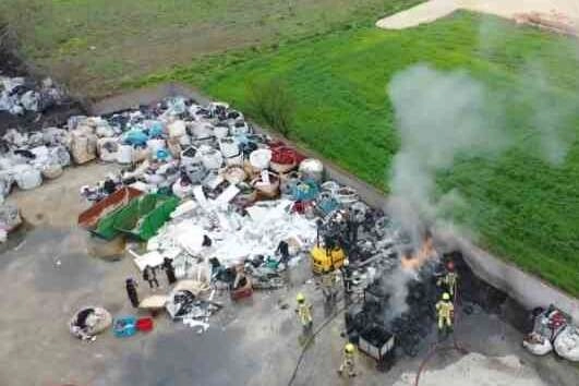 Bursa'da geri dönüşüm tesisinde çıkan yangın itfaiye ekipleri tarafından söndürülürken, o anlar havadan görüntülendi.