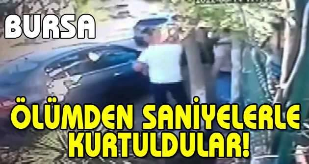 Aradan bir saniye geçmeden hızla gelen otomobil kapıya saplandı. O anlar kameraya saniye saniye yansıdı. Kaza, merkez Nilüfer ilçesi Başköy Mahallesinde meydana geldi. İddiaya göre, akrabalarına misafirliğe gelen bir grup gidecekleri sırada kapının önünde vedalaştı. Vedalaşmanın ardından araçlarına binmek için hareket ailenin kapının önünden ayrılmasından bir saniye sonra hızla gelen otomobil kapıya saplandı. O anlar güvenlik kamerasına anbean yansıdı. Kazada şans eseri ölen olmazken otomobil içerisinde bulunan iki kişi hafif şekilde yaralandı. Kazadan kıl payı kurtulan misafirlerin ise şok geçirdiği anlar kameradan görüldü.