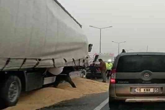 Kaza sabah 07.00 sıralarında Bursa-Ankara karayolu üzeri İnegöl girişinde meydana geldi. Bozüyük istikametinden İnegöl'e seyir halinde olan sürücü Turgut Kaya(41) yönetimindeki 16 ABA 220 plakalı tır, önünde seyir halinde olan sürücü Tahir Sara(34) yönetimindeki 63 ADS 25 plakalı tıra arkadan çarptı. Kaza sonucu sürücü Turgut Kaya Yaralandı. Yaralı olay yerine sevk edilen Ambulansla İnegöl Devlet Hastanesine kaldırıldı. Hurdaya dönen hububat yüklü tır, çekici yardımıyla yoldan kaldırıldı.