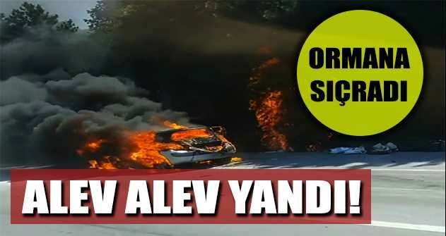 Bursa'da yol kenarında yanan otomobildeki alevler ormana sıçradı. O anlar kameralara yansıdı.