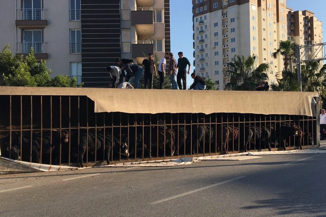 Mersin’in Erdemli ilçesinde canlı büyükbaş hayvan taşıyan tır devrildi. Kazada sürücü yaralandı, bazı hayvanlar telef oldu. Çanlı olan hayvanları kurtarmak için yoğun bir çalışma gerçekleştirildi. Kaza, Mersin Antalya D-400 karayolunda Erdemli ilçesi Ayaş Mahallesi’nde meydana geldi. Alınan bilgiye göre, Turgut Ç'nin idaresindeki 56 AE 808 plakalı tır, sürücüsünün direksiyon hakimiyetini kaybetmesi sonucu bir sitenin istinat duvarına çarparak devrildi. Kazayı görenlerin haber vermesi üzerine olay yerine sağlık, polis ve itfaiye ekipleri sevk edildi. Kazada yaralanan sürücü, ambulansla ilçe devlet hastanesine kaldırıldı. Tırın dorsesinde bulunan yaklaşık 60 büyükbaş hayvandan bazıları telef oldu. Sıkışarak yaralanan bazı hayvanların kurtarılması için itfaiye ekibi ve vatandaşlar seferber oldu. Tek tek kurtarılan hayvanlar başka bir araca nakledildi. Kaza ile ilgili soruşturma sürüyor.