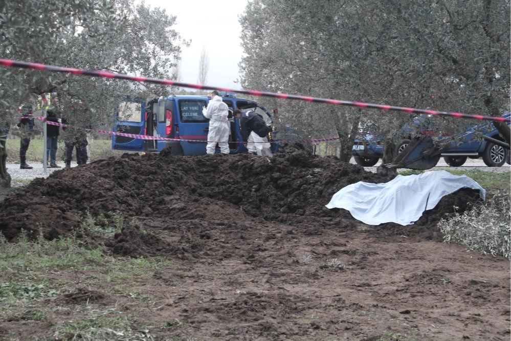 Kepçe ile zeytin ağaçlarının altına gübre serpmeye çalışan zeytinlik sahibi B.S. kepçeye bir şeyin takıldığını fark etti. Aşağı indiğinde ise gübrelerin arasında bir ceset görünce durumu jandarma ekiplerine bildirdi.