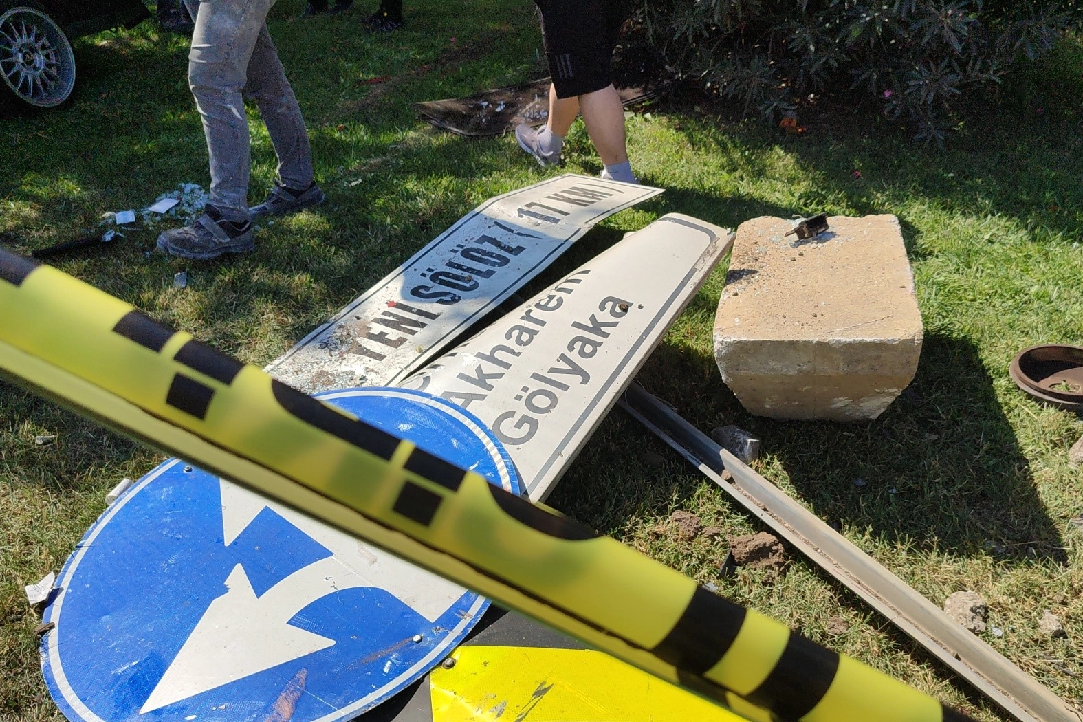 Savrulan otomobil takla atarak refüjde bulunan tabelalara çarptıktan sonra ters döndü.
