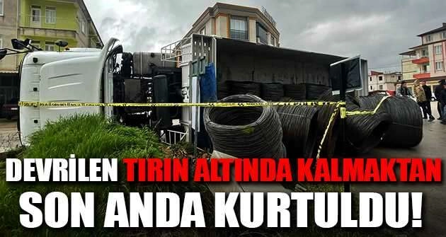 Olay, İznik ilçesi çevre yolu Topkapı mevkisinde meydana geldi. Edinilen bilgiye göre, Samet Bozgül (32) idaresindeki 10 DAS 47 plakalı tır, viraja hızlı girince sürücüsünün kontrolünden çıkarak dorsesinde bulunan demirler ile birlikte yan yattı. O esnada karşı şeritten giden motosiklet sürücüsü devrilen tırın altında kalmaktan son anda kurtuldu. Tır sürücüsü çevredekilerin yardımıyla tırdan çıkartılırken olay yerine çağırılan ambulans ile tedbir amaçlı İznik Devlet Hastanesi'ne kaldırıldı. Trafiğe bir süre kapanan yol tırın vinç yardımıyla kaldırılmasının ardından trafiğe yeniden açıldı. Bu anlar bir işyerinin güvenlik kamerasına saniye saniye yansıdı.