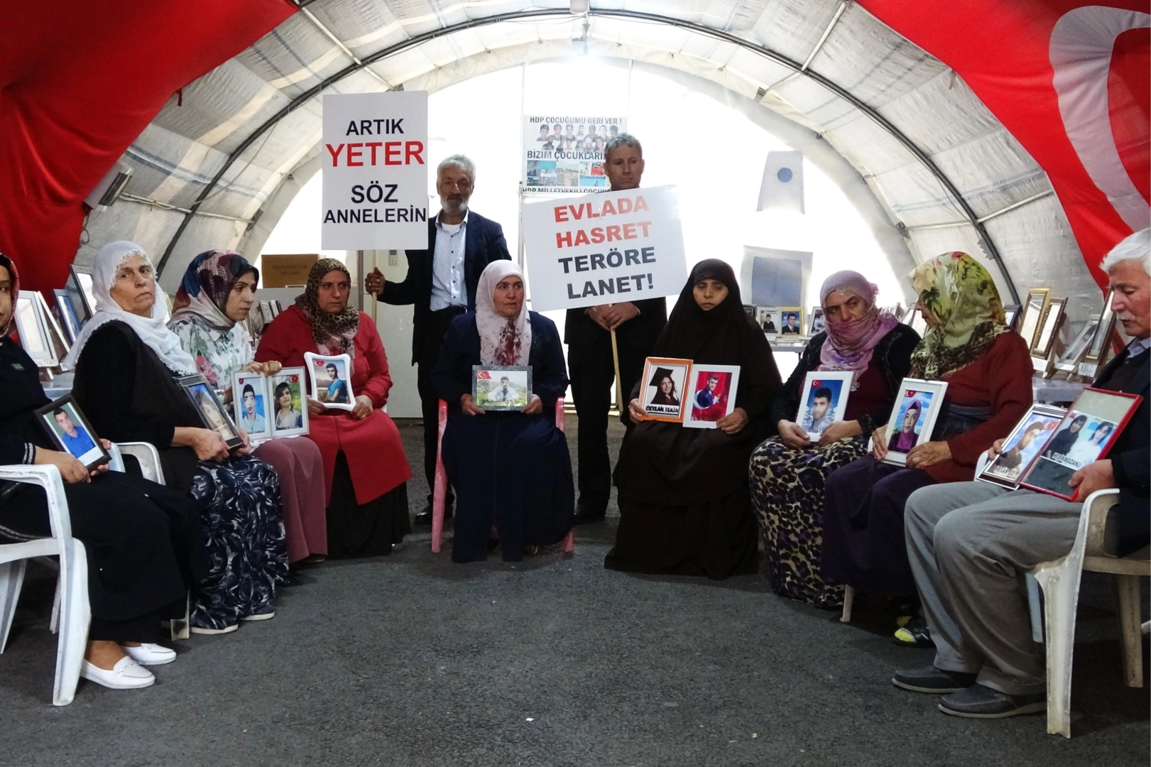 3 Eylül 2019 tarihinde farklı kentlerden Diyarbakır’a gelerek HDP önündeki çadırda oturma eylemi başlatan ailelerin evlat nöbeti bin 529 gündür aralıksız devam ediyor. Oğlu Aziz’in 8 yıl önce HDP aracılığıyla kandırılıp terör örgütüne teslim edildiğini ileri süren Güzide Demir, evladına ‘teslim ol’ çağrısında bulundu. Evladını alana kadar HDP il binasının önünden bir yere ayrılmayacağını dile getiren Demir, “5 senedir biz bu çadırda evlatlarımız için oturma eylemimizi sürdürüyoruz. Çocuklarımız gelene kadar buradan bir yere gitmeyeceğiz. Benden ne istediler? Oğlumu bana geri versinler. HDP oğlumu kandırıp PKK’ya teslim etti. Orada oğlumu dağa, taşa mahkum ettiler. Oğlum Aziz, neredeysen gel güvenlik güçlerimize teslim ol. Teslim olan evlatlardan hiçbiri ceza almadı. Sen de gel teslim olan evlatların arasına katıl. 8 senedir senden haber alamıyorum. Artık bu hasret bitsin, gel evine” dedi. İstanbul’dan çocuğu Fırat için Diyarbakır’a gelen Ziyamet Altunbey, evladının 17 yaşındayken ortalıktan kaybolduğunu söyledi. Altunbey, “İstanbul’da oğlum fırında çalışıyordu. Evladım berbere gitti ve daha da geri gelmedi. Oğlum daha 17 yaşındaydı. Oğlum, artık gel. Bak hasta olmuşum. Baban ve kardeşlerin hepsi seni özledi. Oğlum gibisini daha dünyada görmemiştim. Kim kandırdı? Kim götürdü? Bilemiyoruz. Oğlum kaybolmasıyla ilgili her yere başvuruda bulunduk ama bulamadık” ifadelerinde bulundu.