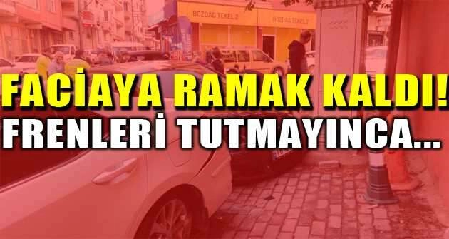 Bursa'nın Orhangazi ilçesinde yokuş aşağı frenleri tutmayan bir otomobil önce seyir halindeki bir motosiklete daha sonra da park halindeki araçların arasına dalarak durabildi.